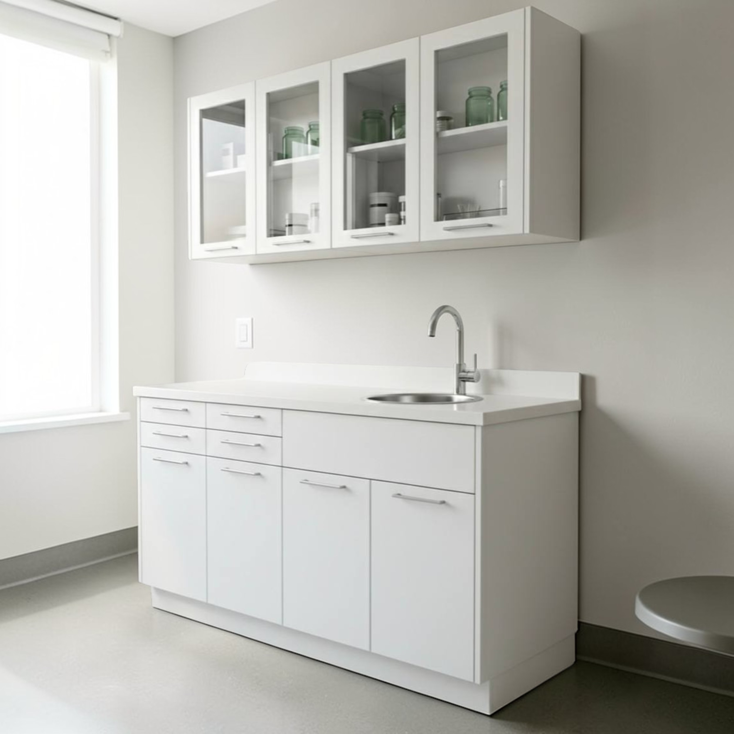 Este juego bajo mesada y alacena odontológico incluye puertas con vidrio en la parte superior, que aportan un toque sofisticado y permiten una visualización rápida del contenido. La mesada de melamina resistente está equipada con una práctica bacha de acero inoxidable y un grifo monocomando, facilitando la higiene y comodidad en cada uso.